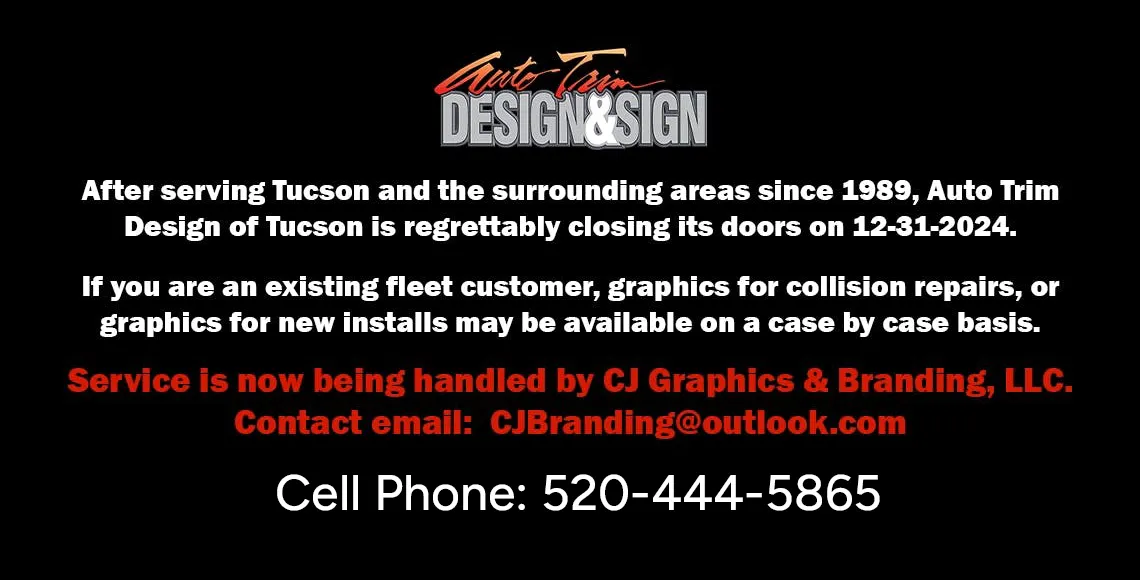 After serving Tucson and the surrounding areas since 1989, Auto Trim Design of Tucson is regrettably closing its doors on 12-31-2024.